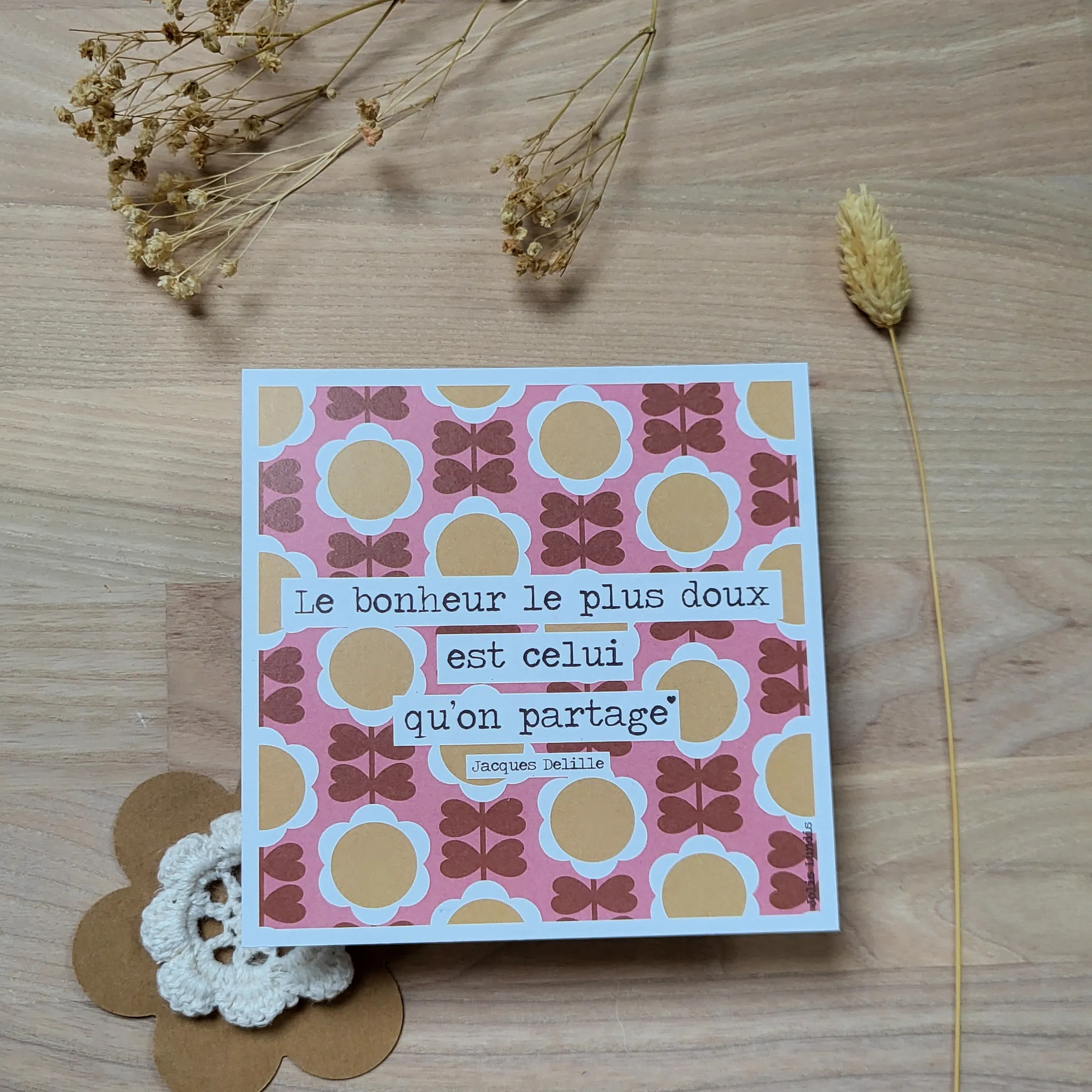 La carte « Le bonheur le plus doux est celui que l’on partage » vient poser un mot tendre sur cette évidence. À offrir ou à garder, sur un bureau, une étagère ou un frigo, elle rappelle que le plaisir des petites choses se multiplie quand il est partagé, et qu’un simple geste ou une attention peut illuminer la journée de ceux que l’on aime.