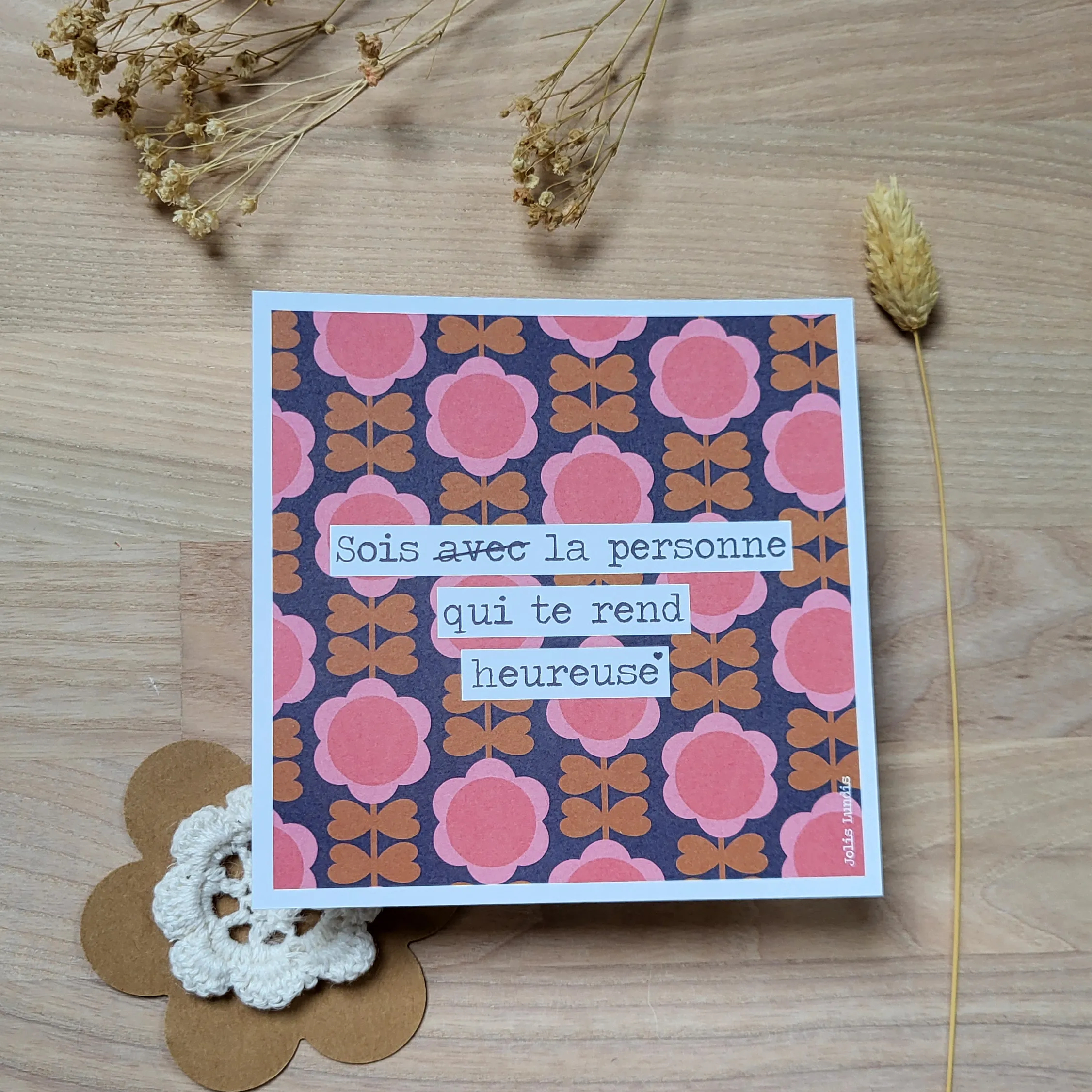 La carte « Sois la personne qui te rend heureuse » vient souffler cette vérité simple et essentielle. À offrir ou à garder tout près, elle devient un doux rappel : celui d’avancer à son rythme, de s’écouter sans se trahir et de cultiver une version de soi qui fait vibrer le cœur un peu plus fort chaque jour.