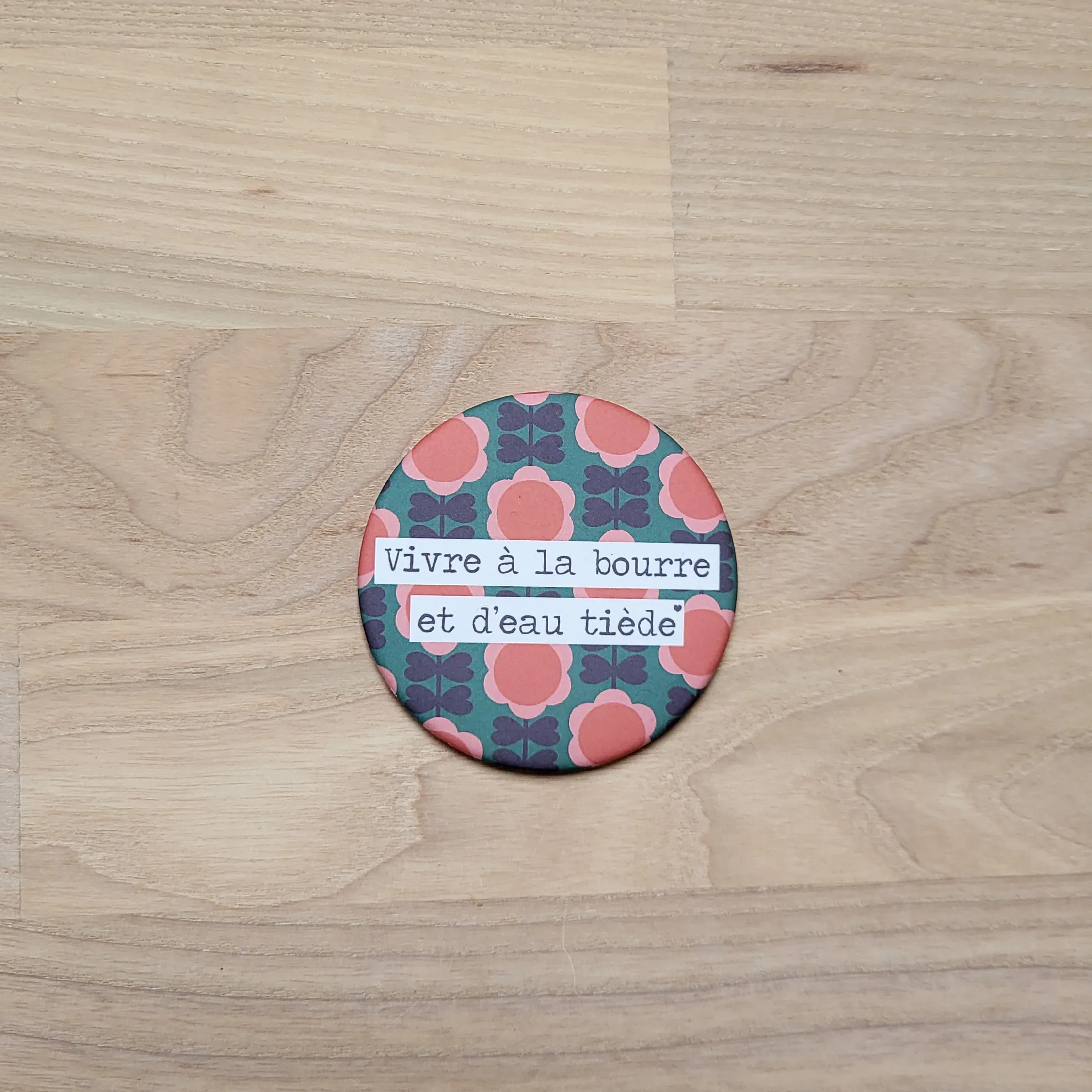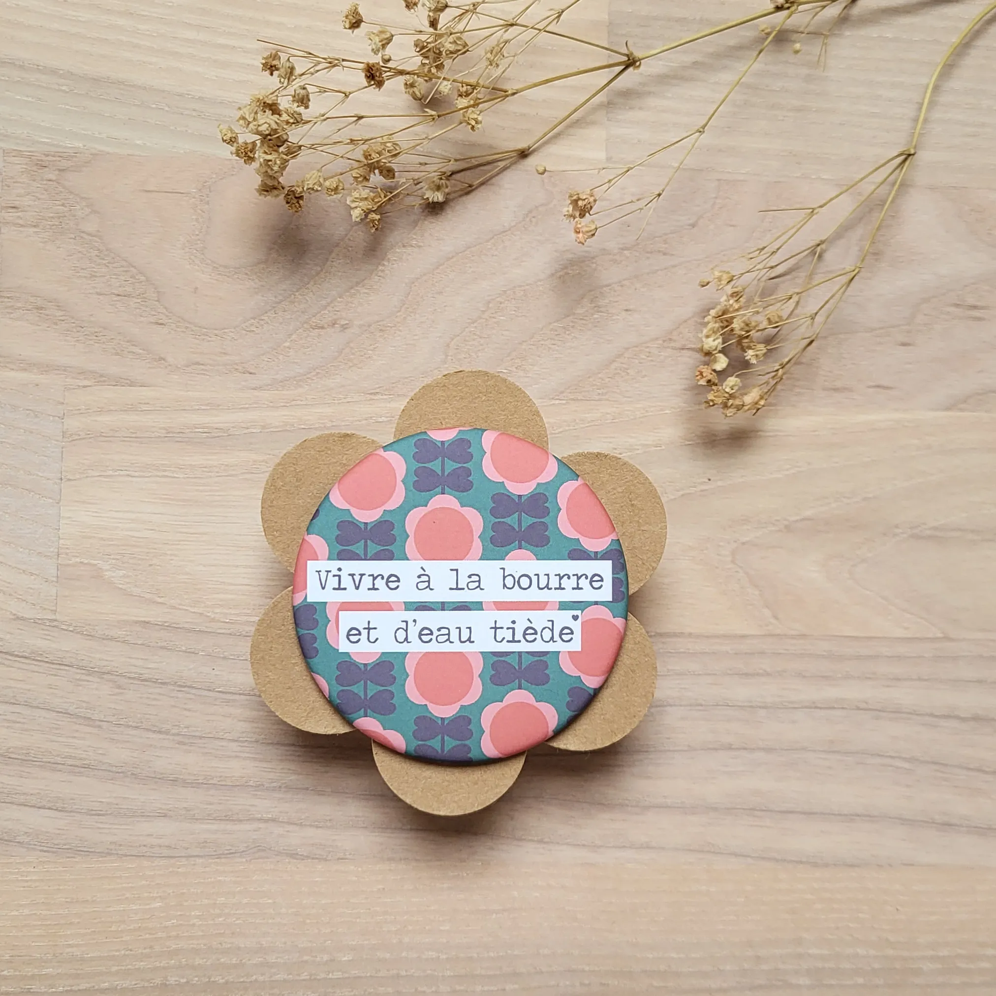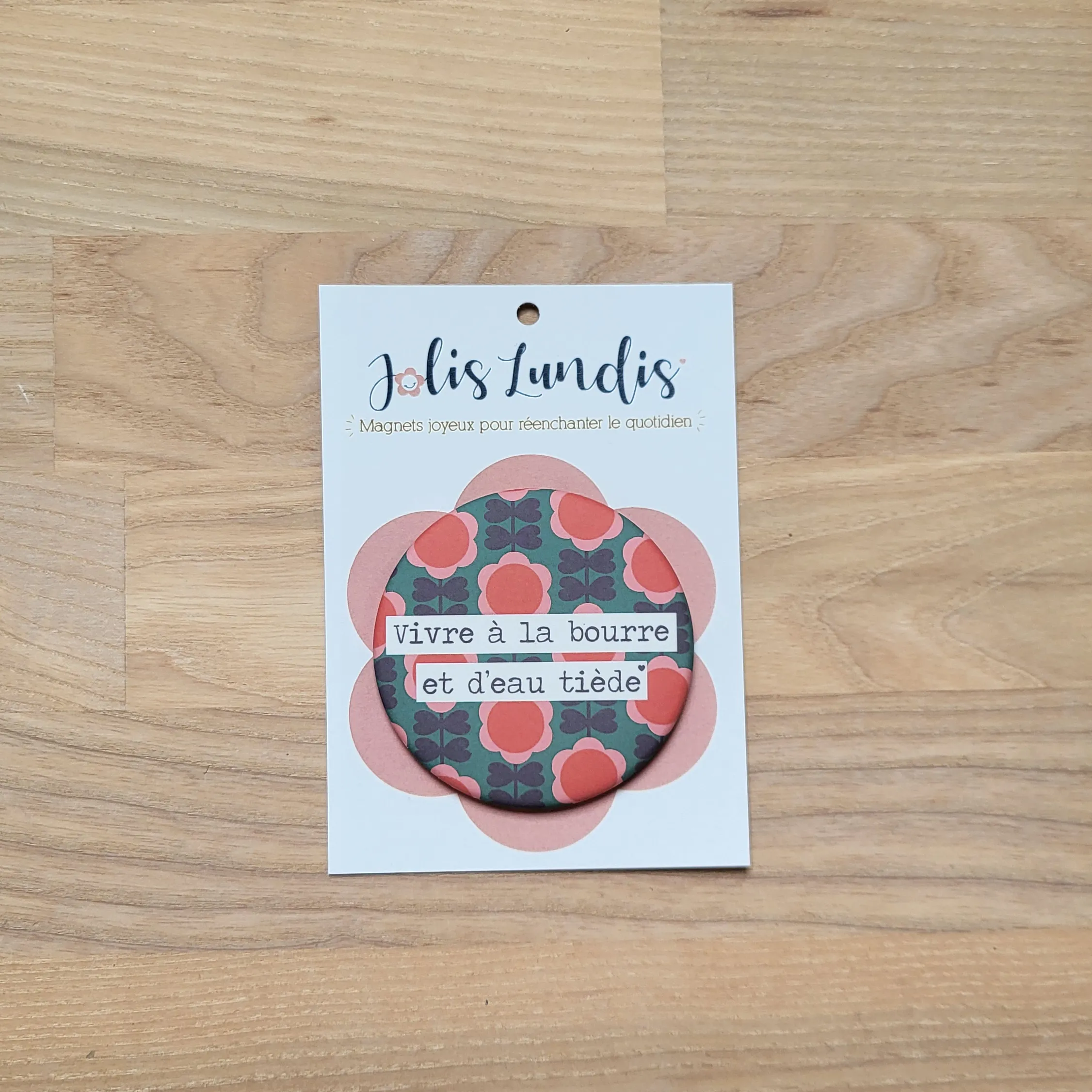 Grâce à la magie des mots, le magnet « Vivre à la bourre et d’eau tiède » vient mettre des mots doux sur ce quotidien un peu dernière minute. Il se glisse dans le décor comme un clin d’œil bienveillant pour alléger ce qui pèse, dédramatiser les journées trop pleines et vous ramener à l’instant présent, tout simplement.